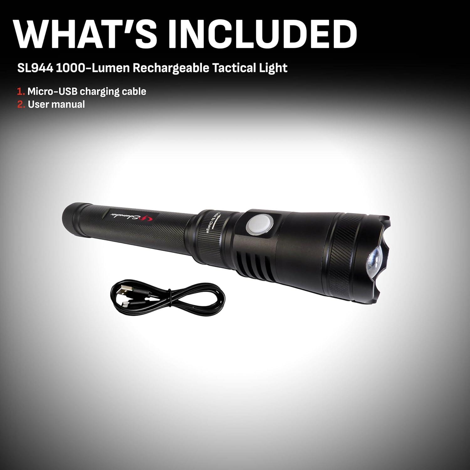 Complete Package – Includes (1) SL944 1000-Lumen Rechargeable Tactical Light, (1) micro-USB charging cable, and (1) user manual