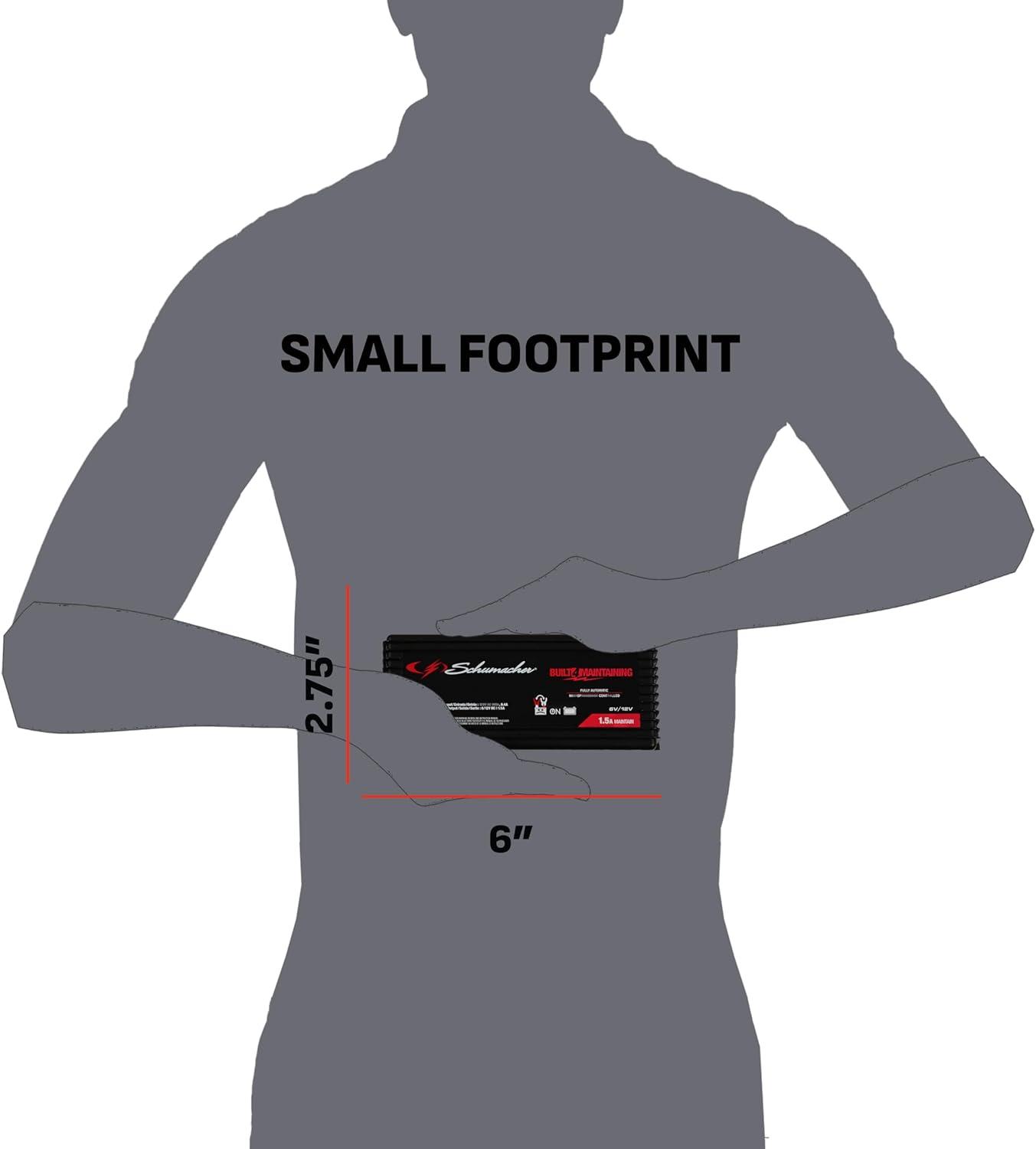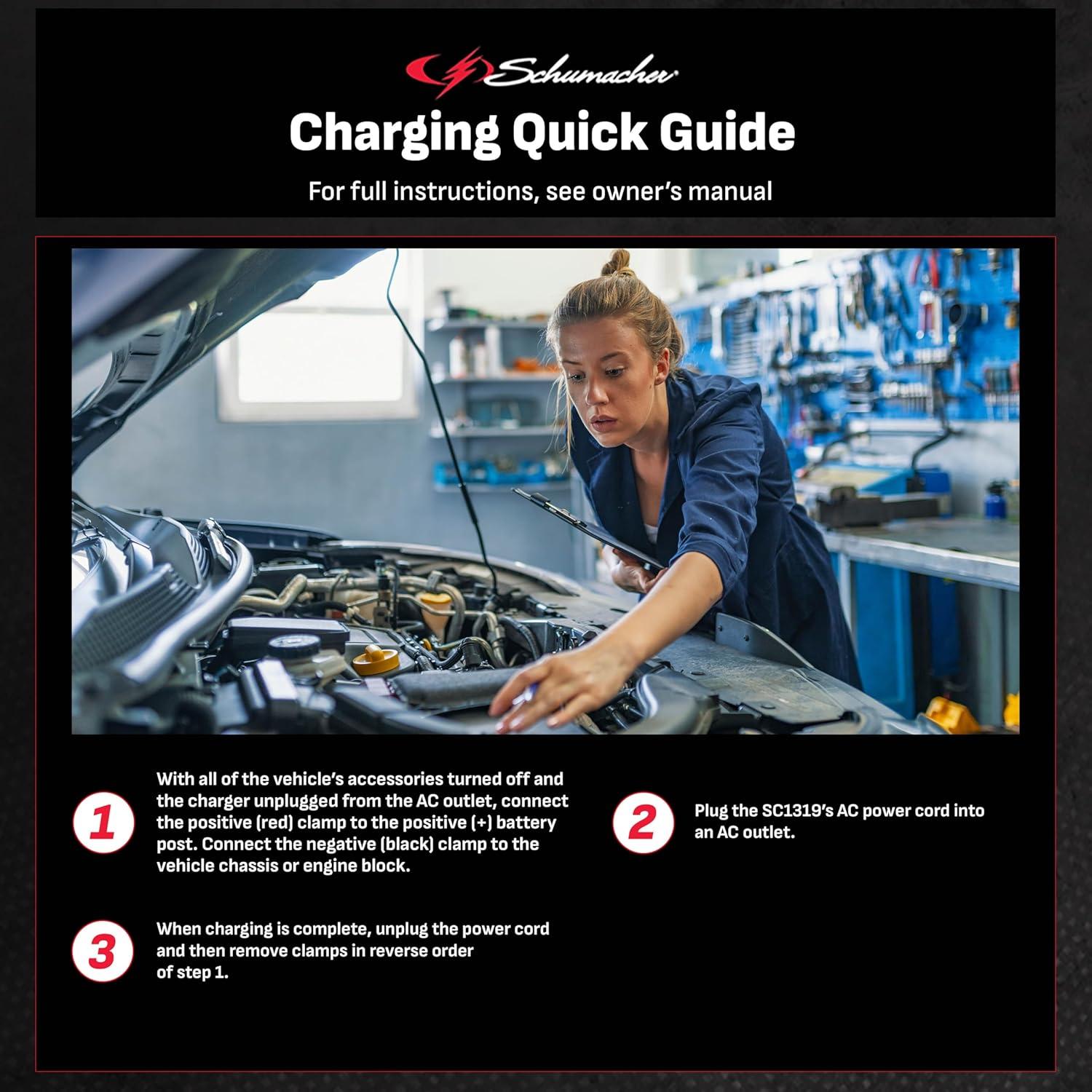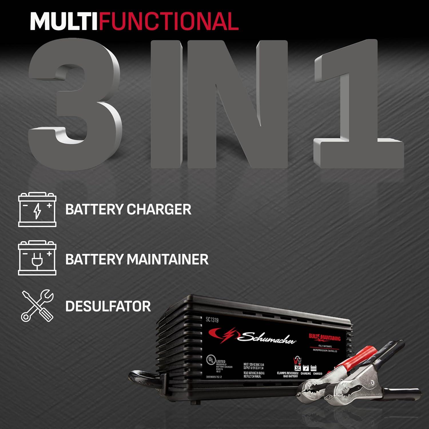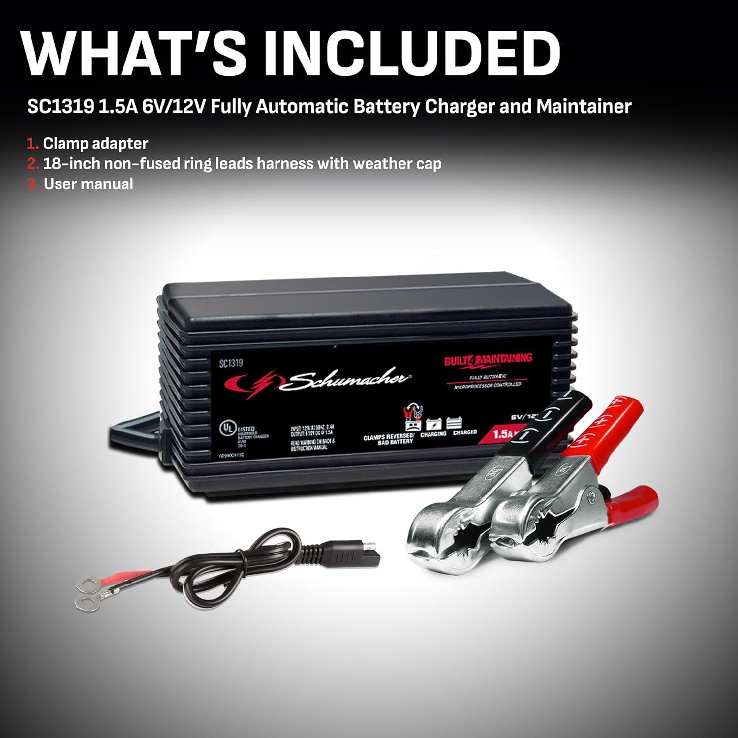 The Schumacher SC1319 Battery Maintainer is a great option for power sport, car, and marine batteries. The microprocessor automatically adjusts the amperage rate, with multi-stage charging and float mode monitoring for optimum charging and maintaining to extend battery life. Includes a quick-connect harness, LED light indicators, and simple button controls for ease of use, plus reverse hook-up protection which prevents the charger from operating if the clamps are reversed. Schu Eco Energy meets the highest industry standards. Compatible with standard and AGM batteries.