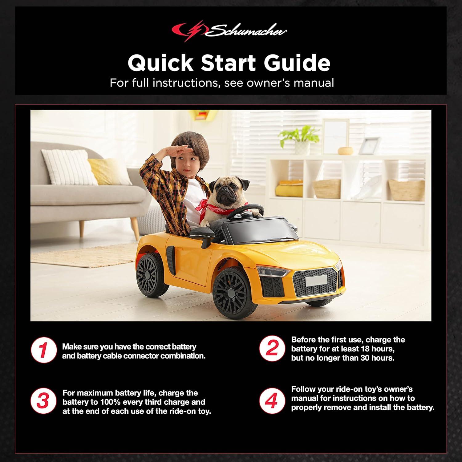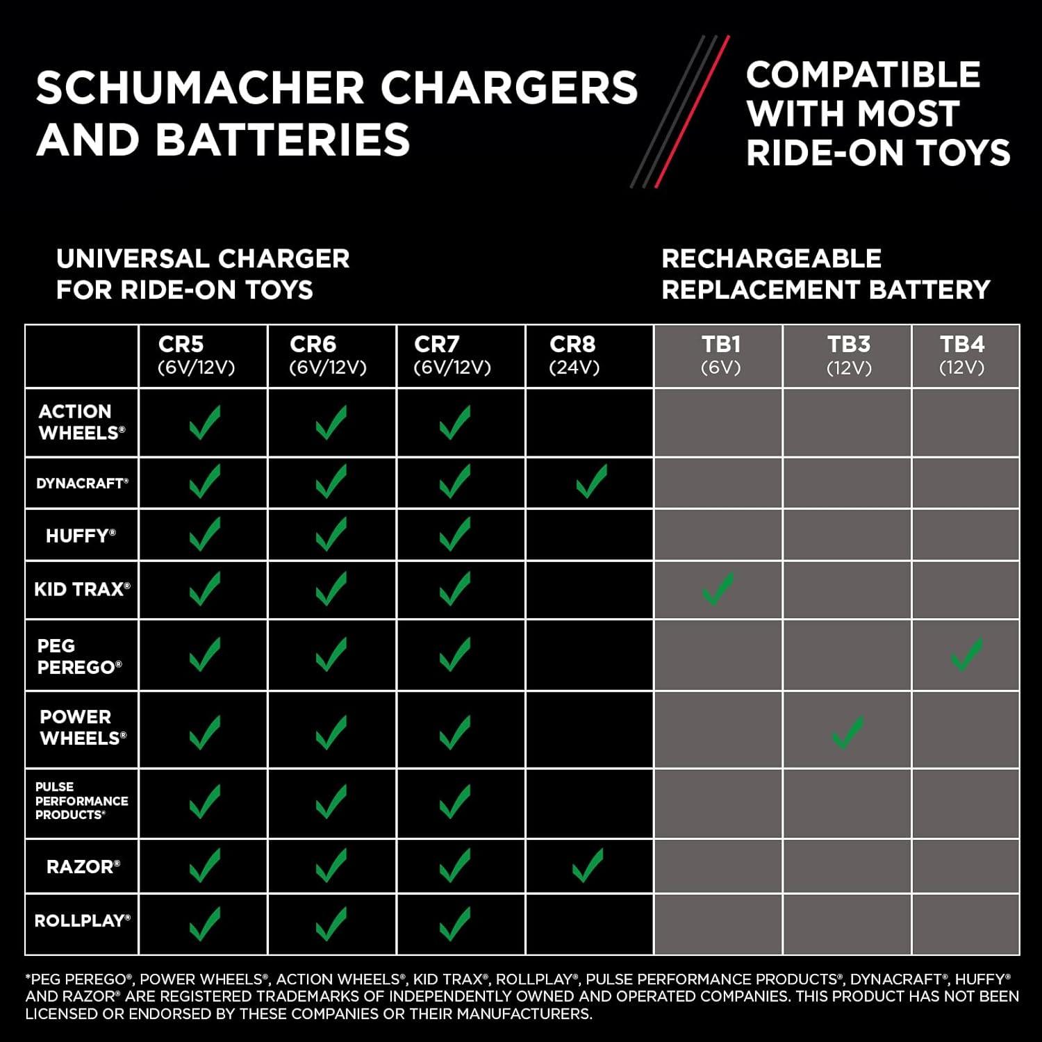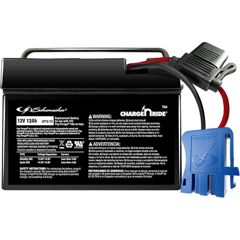 A kid with a ride-on toy will happily drive around the yard until their battery gives out. Keep the fun going longer by keeping an extra battery on hand for your child's favorite 12v battery ride on toys. The Schumacher Charge ‘n Ride TB4 12-Volt Rechargeable Replacement Battery gets budding car fanatics road-ready in no time. Installation is a breeze, and adults can easily install and connect the TB4 in seconds. The 12 Amp Hours TB4 is designed to run Peg Perego 12-volt ride-on toys. This replacement battery can be recharged using the Power Wheels supplied charger. However, for best results, use the Schumacher CR6 3A 6V/12V Universal Battery Charger. For added safety, this sealed, AGM lead acid battery also has a replaceable fuse protects against overcurrent, for added safety during charging and operation. Meanwhile, a built-in handle makes it easier to tote this battery around your garage. So if you've been searching for a premium replacement battery for your child's 12 volt Peg Perego ride on toys, consider shopping Schumacher to find out why countless parents have already grown to love us.