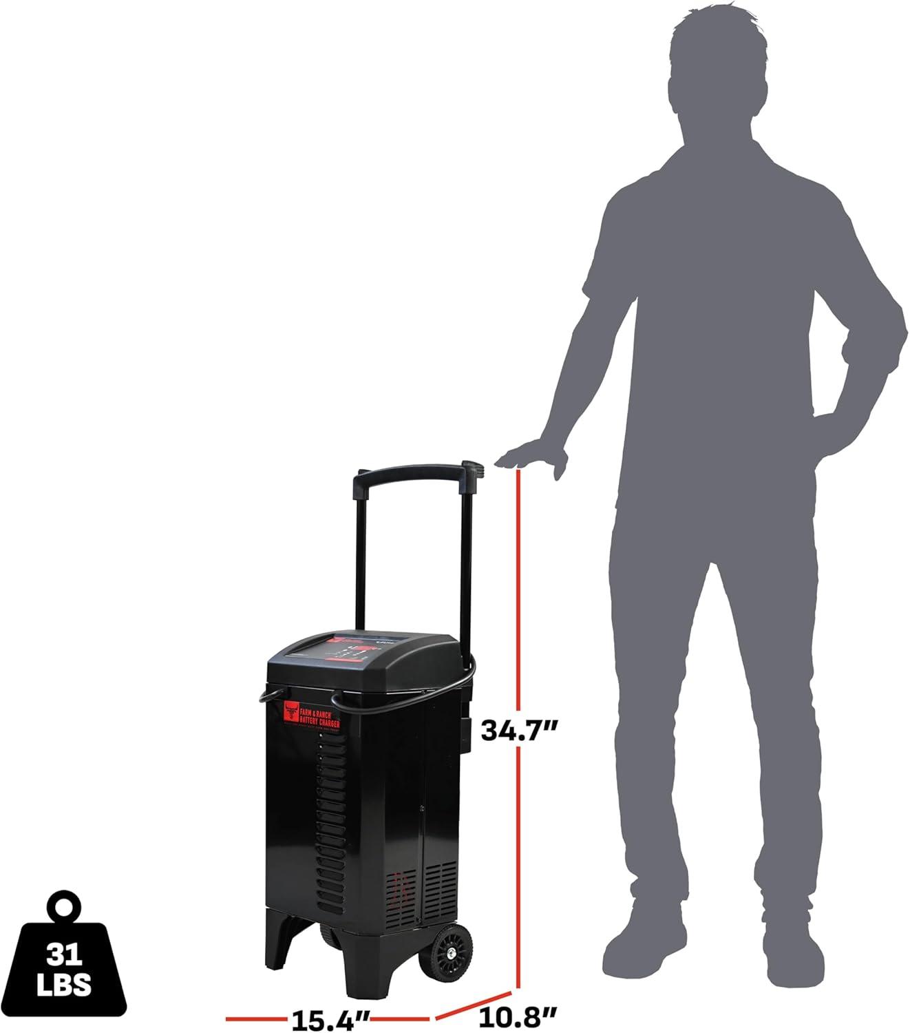 Built to withstand tough farm life, the FR01336 features a heavy-duty steel case, solid-core wheels, and a sturdy handle. Its fully automatic operation is controlled by an internal processor, utilizing auto voltage detection, multi-stage charging, bad battery detection, float mode monitoring, desulfation, and reverse hook-up protection. This versatile charger is compatible with 6-volt and 12-volt standard, AGM, gel, and deep-cycle automotive batteries.