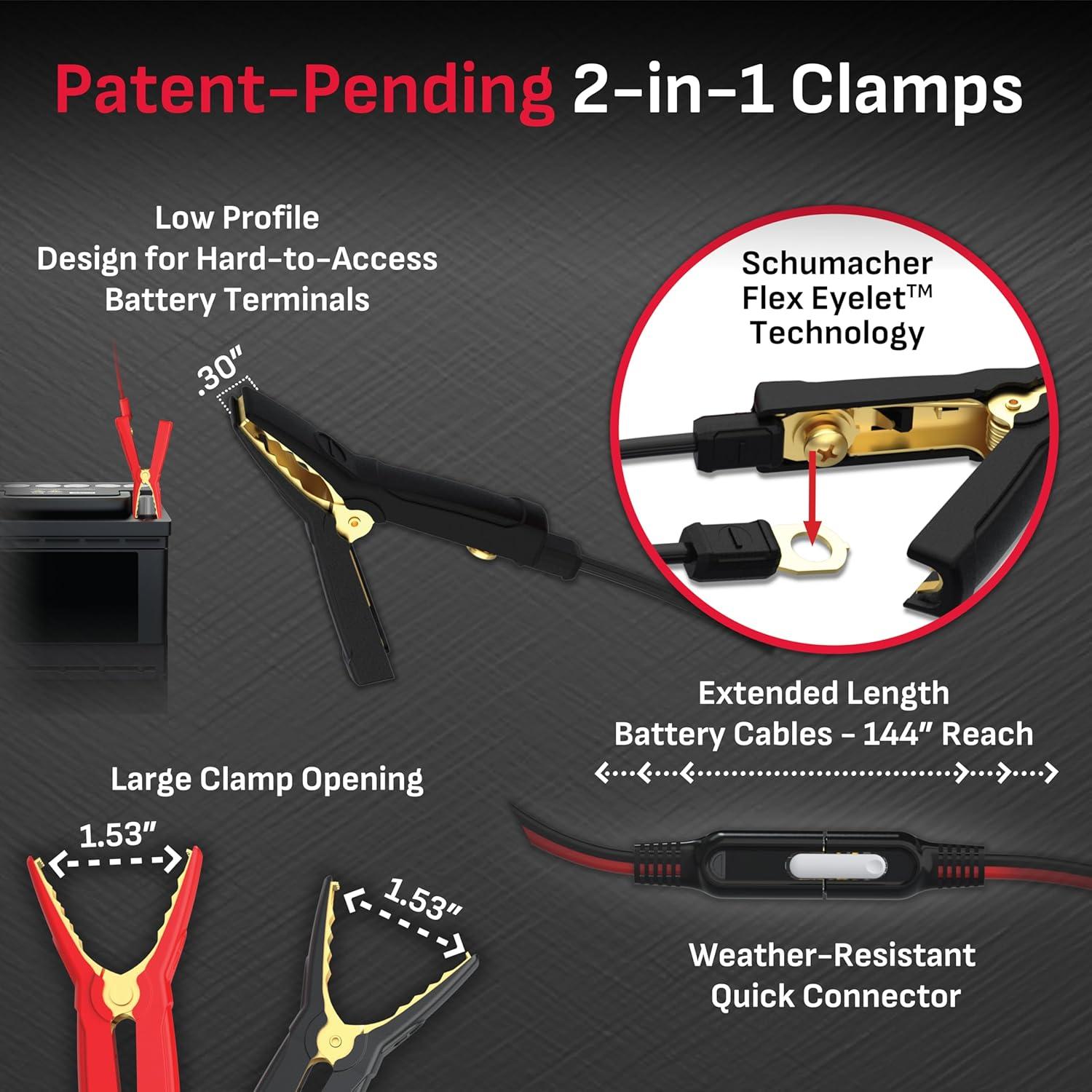 Safety and usability are at the heart of the SC1677’s design. Patent-pending Flex Eyelet Technology transforms robust low-profile clamps into ring leads simply by removing a single screw, maximizing accessibility for hard-to-reach battery terminals in modern vehicles. Reverse polarity protection and spark-resistant clamps provide added safety and peace of mind.