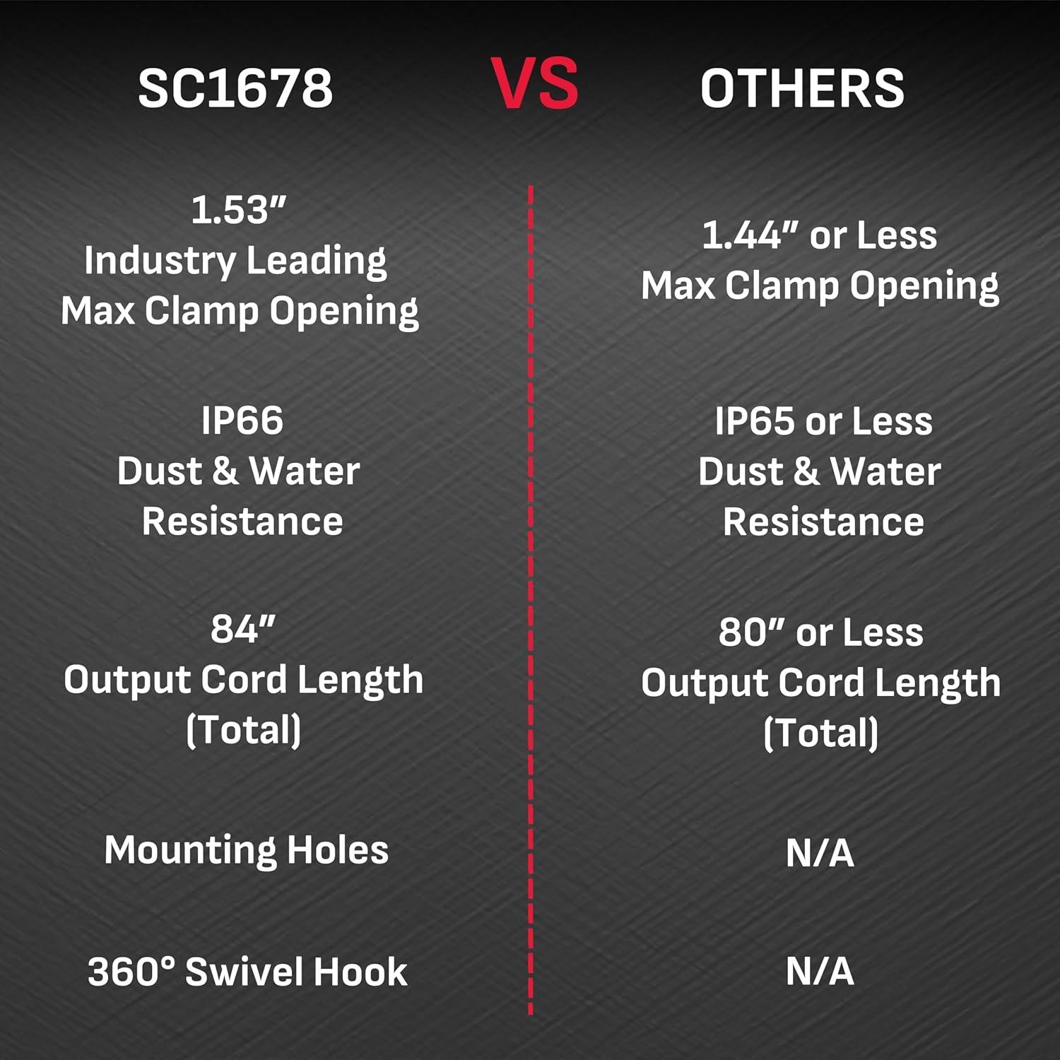 Safety and usability are at the heart of the SC1678’s design. Patent-pending Flex Eyelet Technology transforms robust low-profile clamps into ring leads simply by removing a single screw, maximizing accessibility for hard-to-reach battery terminals in modern vehicles. Reverse polarity protection and spark-resistant clamps provide peace of mind, while the durable, weather-resistant casing lets users charge confidently in a range of situations. Plus, mounting holes in the case and a folding hook offer flexibility for permanent installation or one-time use.