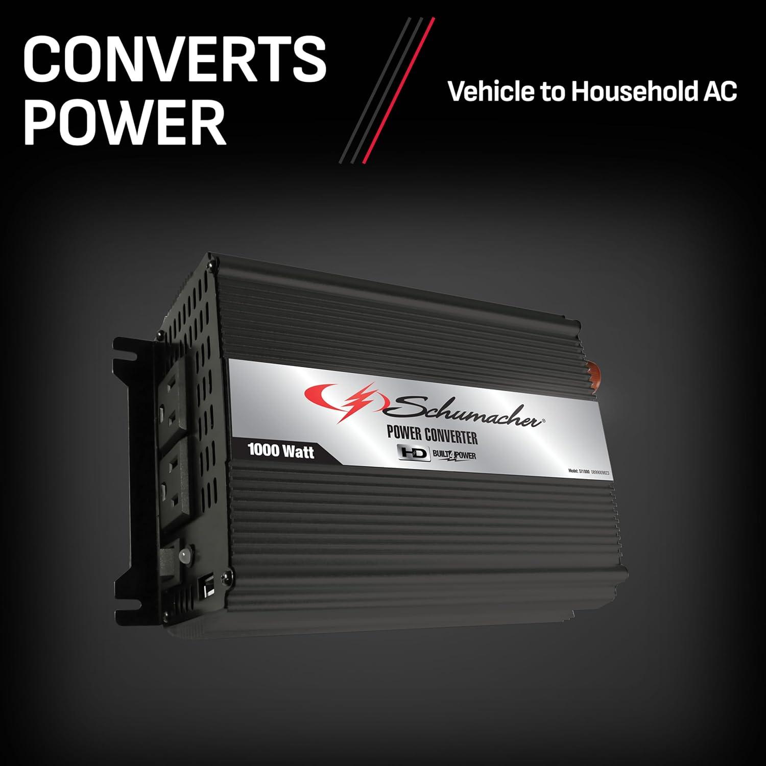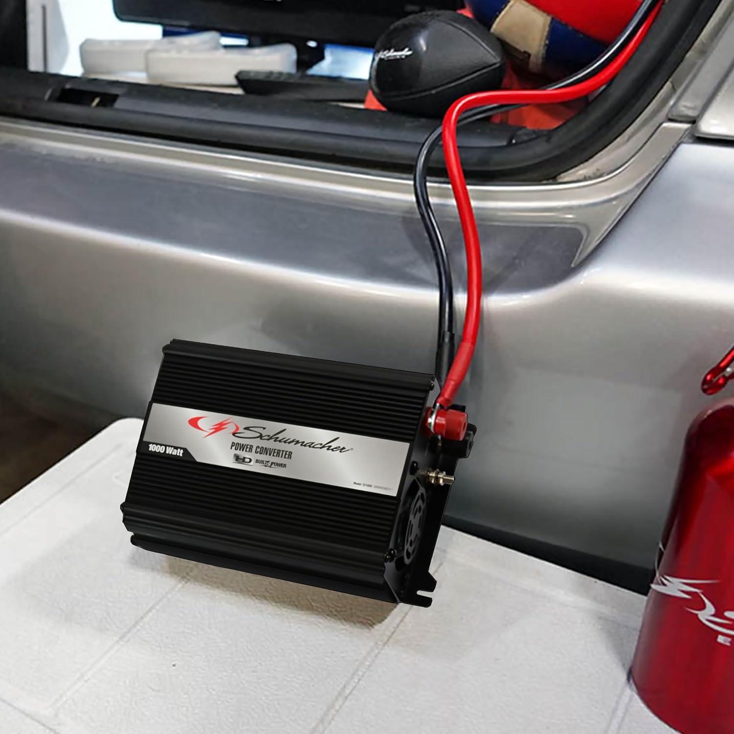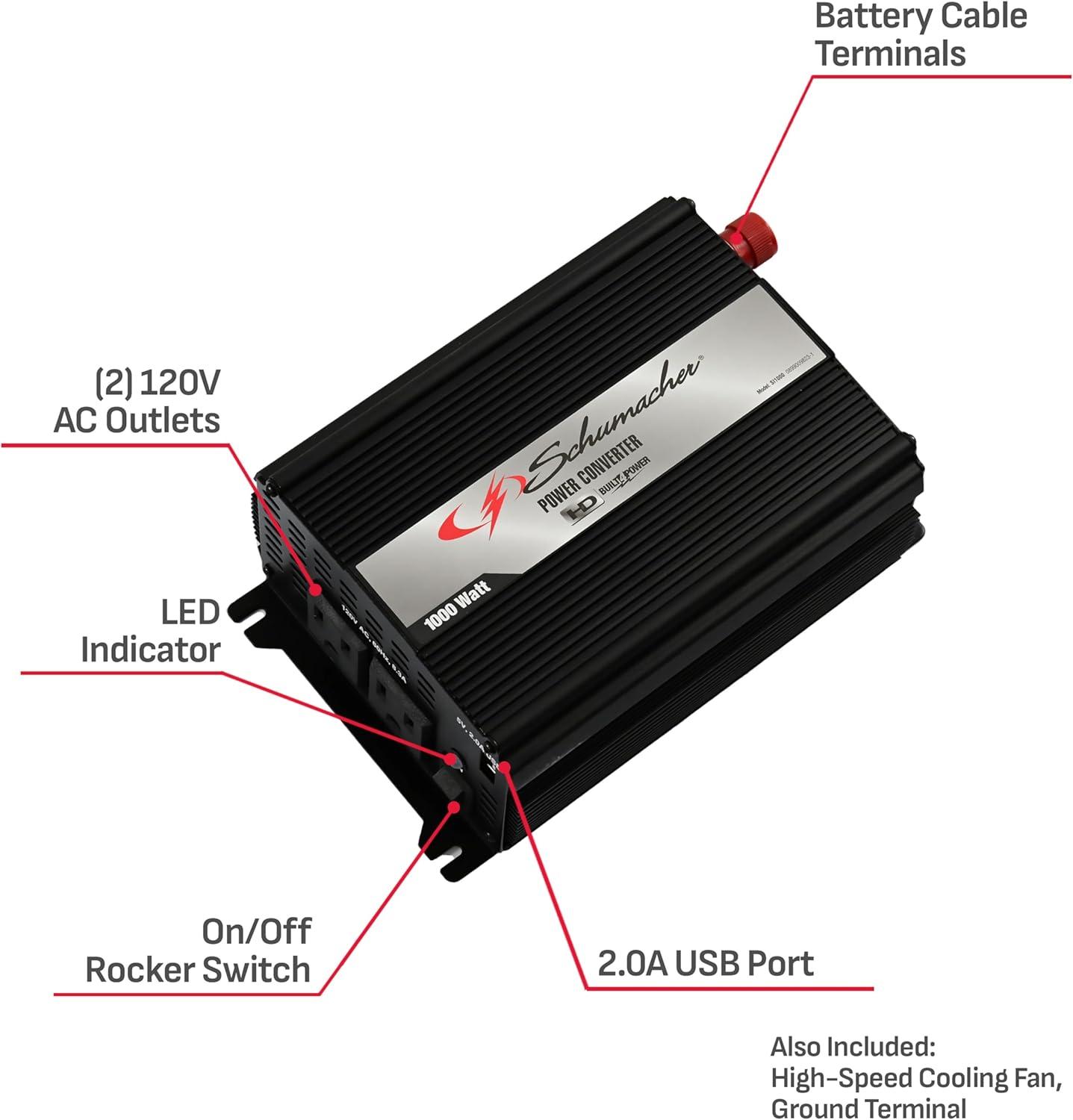 The Schumacher SI1000 1000W DC to AC Power Inverter converts vehicle power to household and USB power. One 5V USB port and two AC outlets make it ideal for emergency power use as well as tailgating, camping, and mobile entertainment. With the ability to power and charge USB and 120V devices, the unit attaches directly to your vehicle's battery with included ring connectors. Includes LED indicator, a built-in high-speed cooling fan, overheat protection, and surge protection.