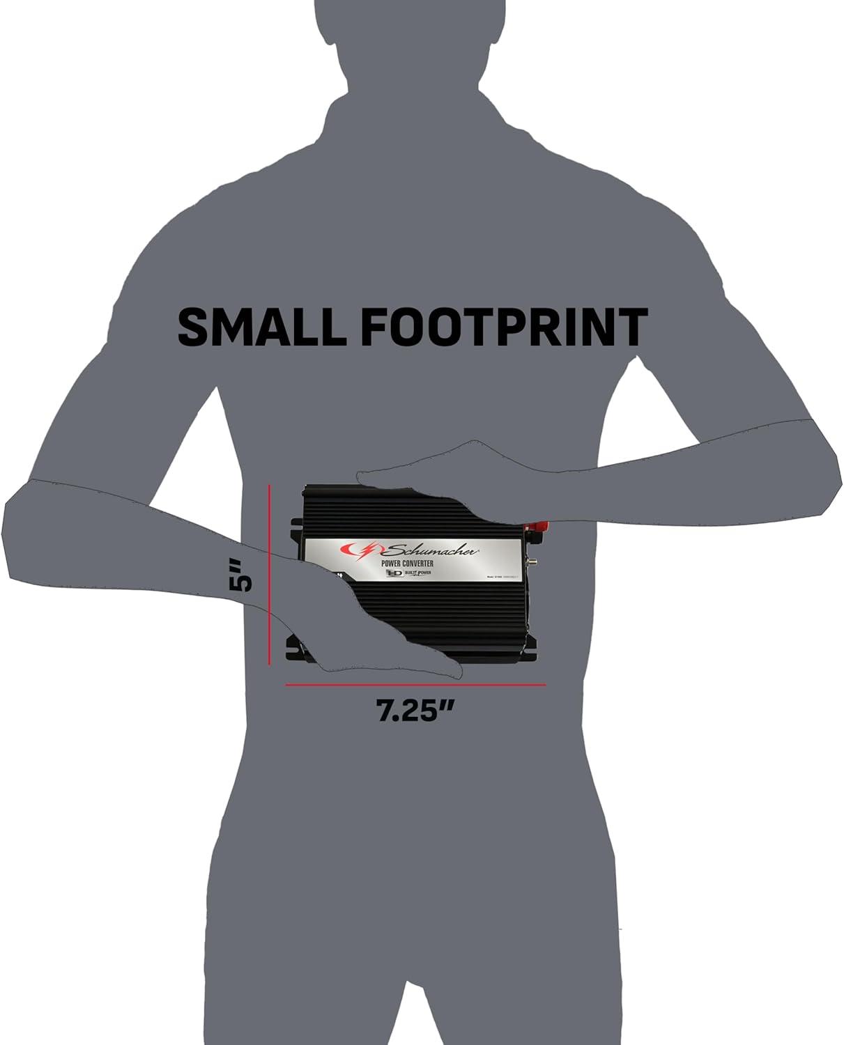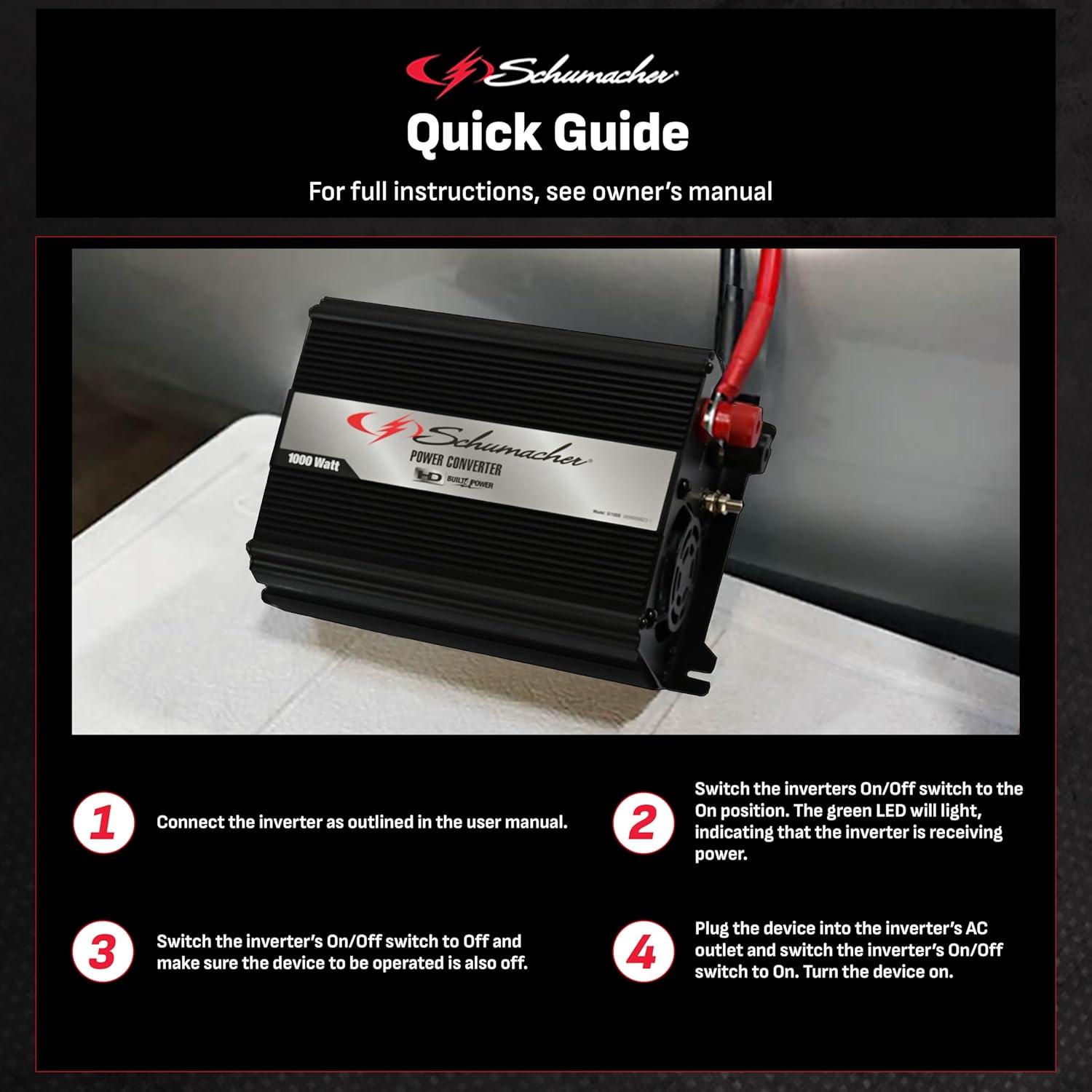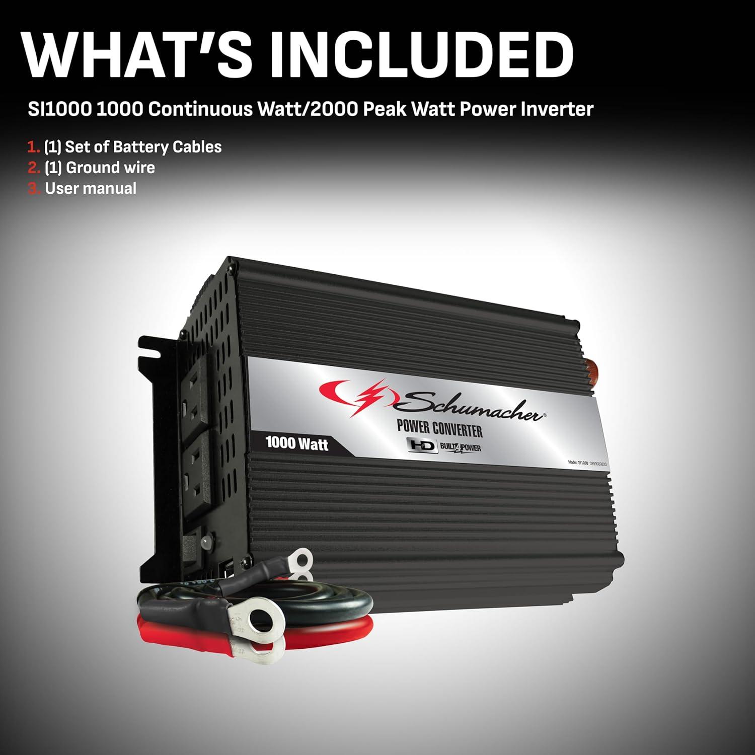 The Schumacher SI1000 1000W DC to AC Power Inverter converts vehicle power to household and USB power. One 5V USB port and two AC outlets make it ideal for emergency power use as well as tailgating, camping, and mobile entertainment. With the ability to power and charge USB and 120V devices, the unit attaches directly to your vehicle's battery with included ring connectors. Includes LED indicator, a built-in high-speed cooling fan, overheat protection, and surge protection.